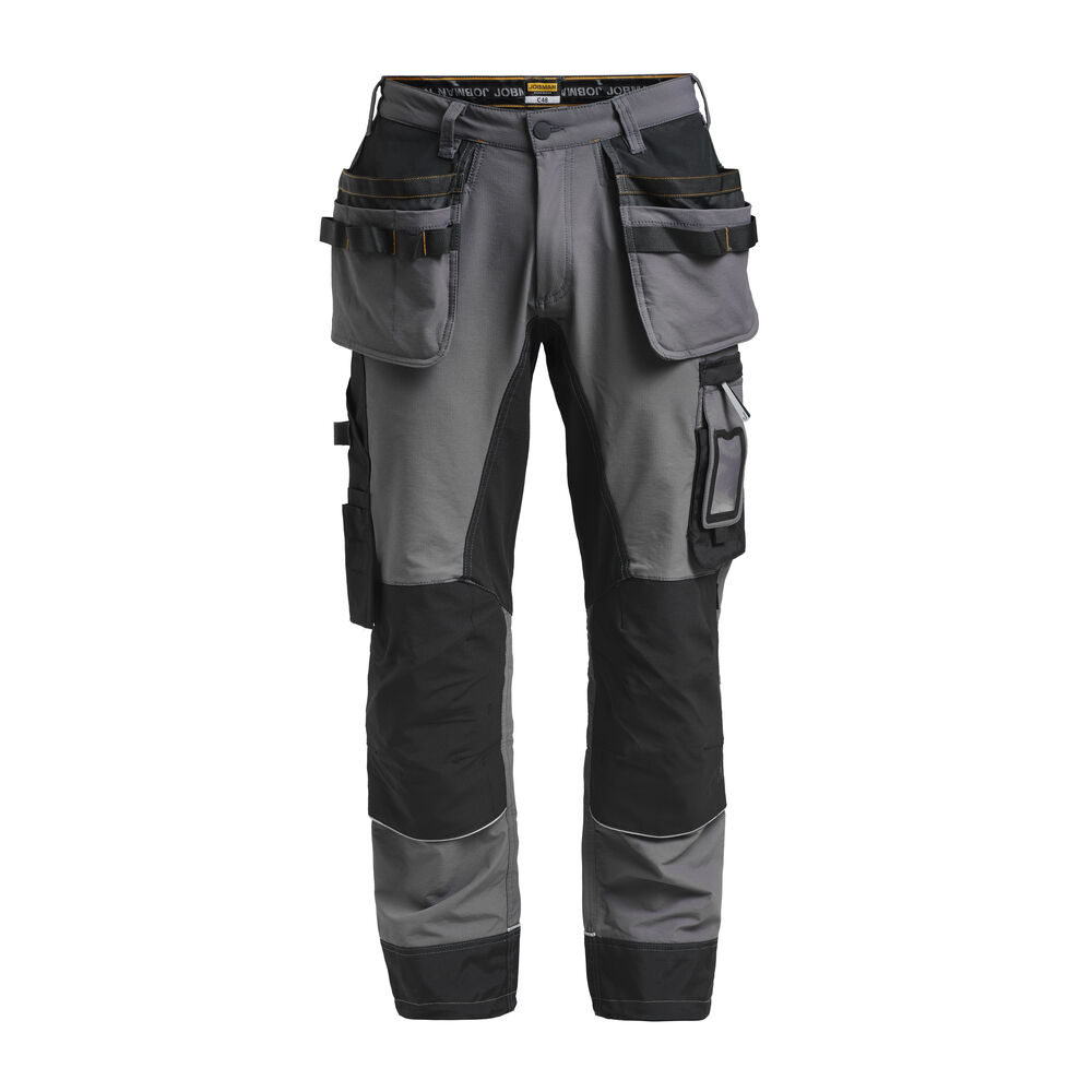Smidig 4-vägs stretch i slitstarkt Rip-stop material. Rymliga hölsterfickor med extrafack och förstärkt insida som kan stoppas ned i framfickorna. Silikonband i byxlinningen håller byxan på plats. Grenkil med förstärkt stretch Cordura®. Delvis frihängande bakfickor gör att du lättare kommer åt innehållet. Extra hällor för bältet på de största storlekarna. Hammarhank. Tumstocksficka med knivhållare. Benficka med täckt blixtlås, ID-kortsfack och telefonfack. Förböjda knän med knäskyddsfickor i slitstark stretch Cordura® med 3M´s reflexpasspoaler och två höjdnivåer. Mesh i knävecken för ventilation. Förstärkt benslut i polyamid som inte absorberar fukt. Reflexpasspoal och dragsko i benslutet.