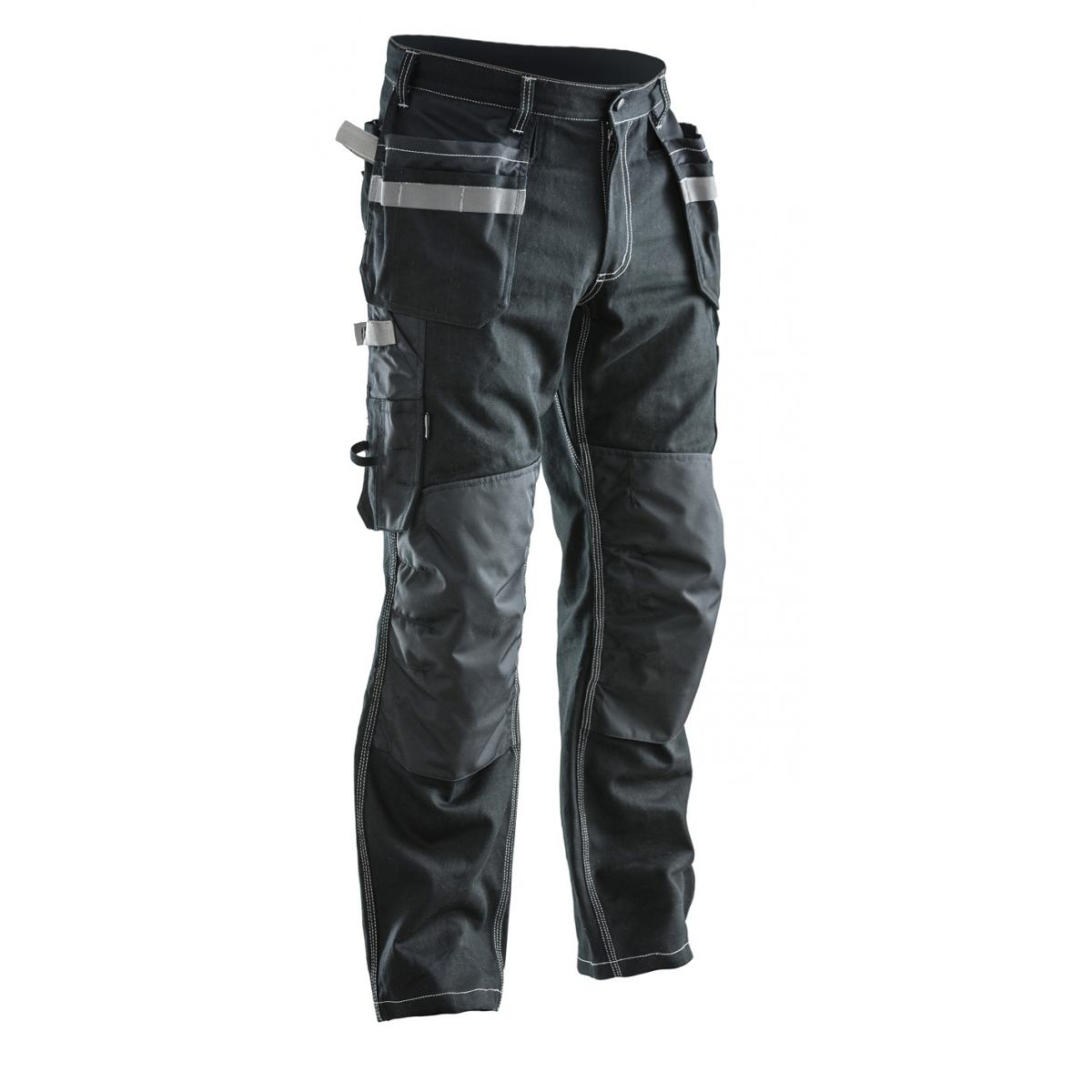 Förstärkningar i polyamid på hölsterfickor, bakfickor, tumstocksficka och knäskyddsfickor. Telefonficka på höften. Rymliga hölsterfickor med extrafack och förstärkt insida. Insydda framfickor som hölsterfickorna kan stoppas ned i. Hammarhank. Bakfickor med förstärkt insida. Framflyttad förstärkt tumstocksficka med lös nederkant och knivknapp. Benficka med telefonfack. Förböjda knän med knäfickor i slitstark polyamid. Knäskyddsfickor med två höjdnivåer. Byxan finns även som herrmodell, 2200. Certifierad enligt EN 14404:2004+A1:2010 Typ 2 Nivå 1 tillsammans med Jobmans knäskydd 9943, 9944 och 9945.
