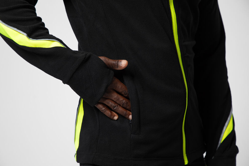 Microfleecejacka med raglanärm för bättre rörelsefrihet. Hel dragkedja framtill med hakskydd för att förhindra skav mot hakan. Bröstficka med dragkedja och invändigt fäste för ID-kort. Sidfickor med dold dragkedja.