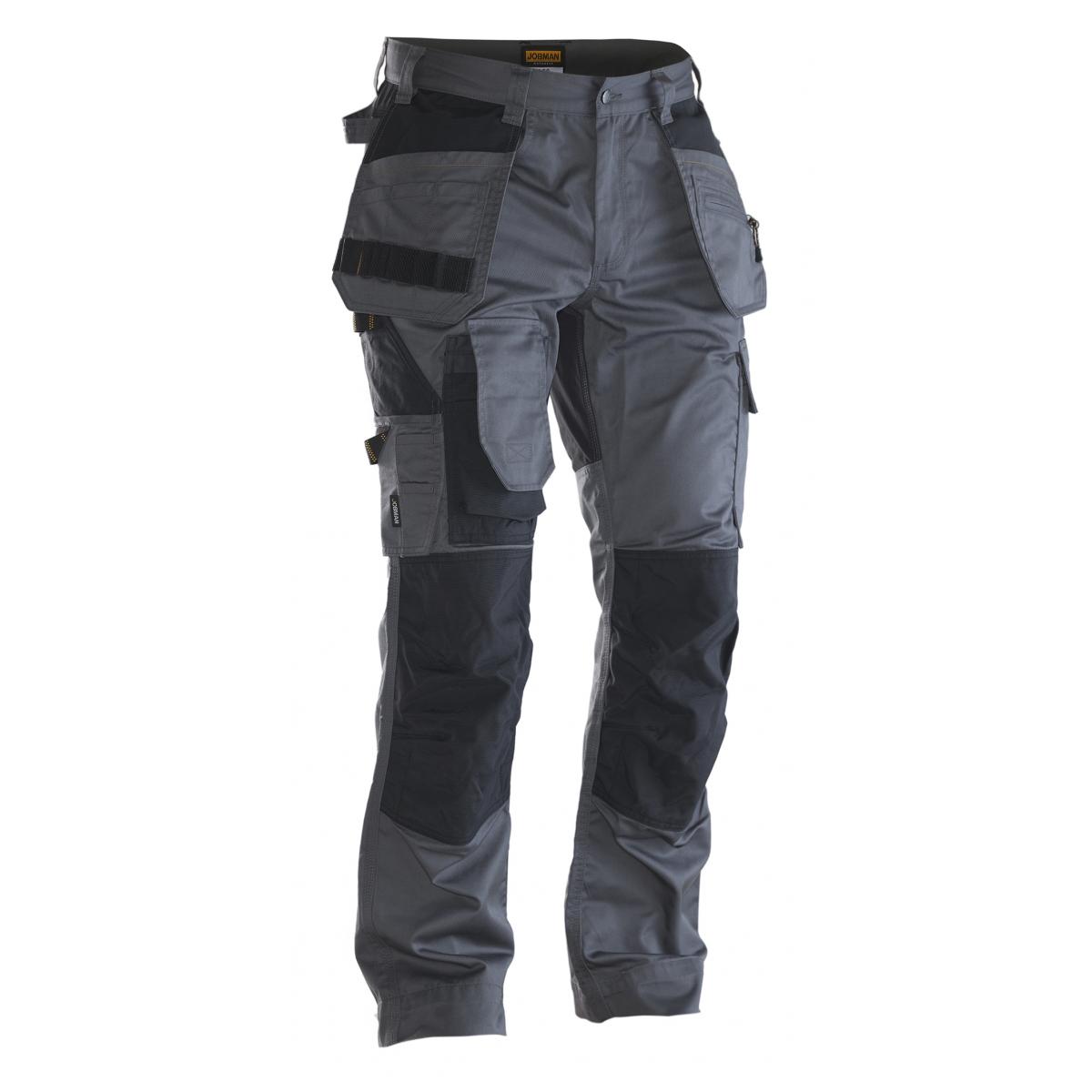 Lättskött polyester/bomull som håller färg och form. Stretchpaneler på bakstycket, för ökad rörlighet. Rymliga framfickor. Hölsterfickor med förstärkning och extra fack och extra ficka med blixtlås. Passpoilfickor bak. Benficka med extra fack och ficklock med kardborrestängning. Tumstocksficka med knivhållare. Ficka för mattläggarknivar på låret. Förstärkning på knäskyddsfickor och med två höjdnivåer för knäskydd. Byxbenet kan förlängas med 5 cm genom ett utvik i benslutet.