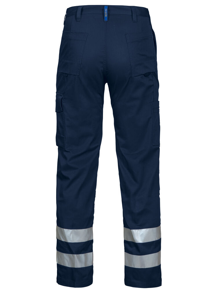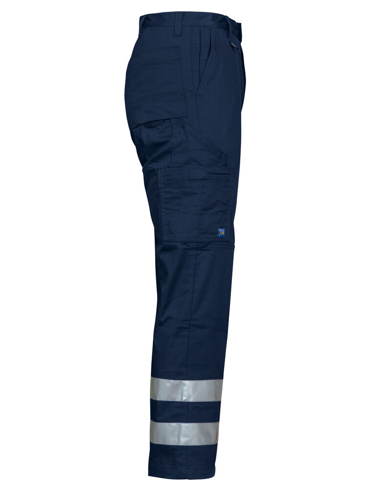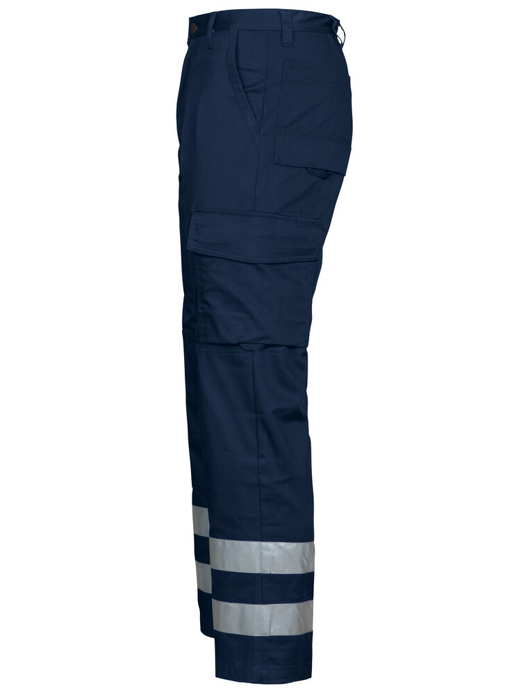 Midjebyxa med två reflexrader á 50mm på vardera benslut. Sidfickor, den högra med insydd säkerhetsficka som försluts med dragkedja. Benfickor, den vänstra med övervidd och lock med kardborrestängning, invändig telefonficka. Den högra har plats för pennor, papper och även tumstocksficka. Utanpåliggande bakfickor. D-ring framtill. Invändiga knäskyddsfickor.