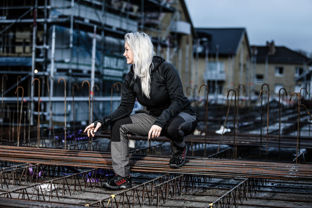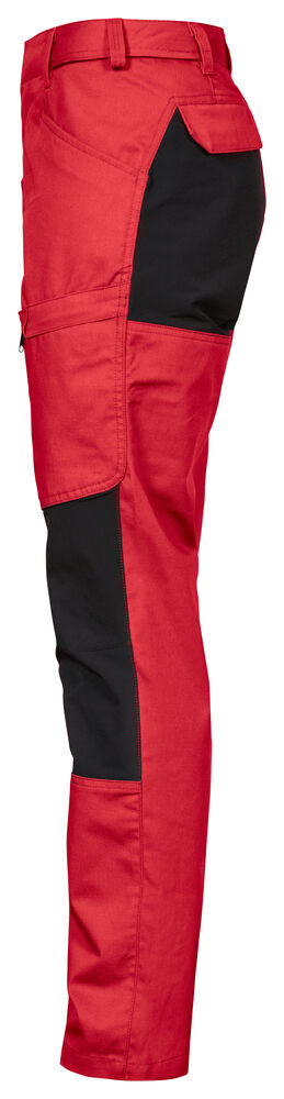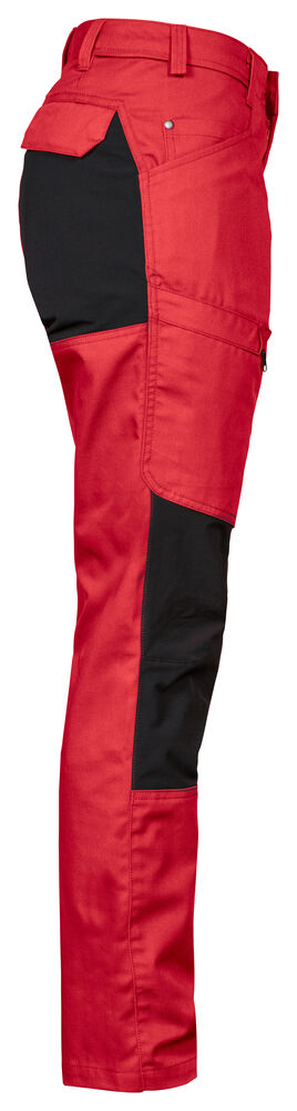 Servicebyxa med stretchparti över rumpa och knä för optimal rörelsefrihet och passform. Benfickor med dragkedja, den vänstra med invändig mobilficka och den högra med hållare för ID-kort. Bakfickor med lock, försluts med kardborre. Bredare bälteshälla baktill för att undvika tryck från bälte vid ryggslut. Dolda fästen för hängfickor i linningen (ref. art 9042). Dold midjeknapp. Byxan kan förlängas 5 cm genom ett utvik i benslutet.