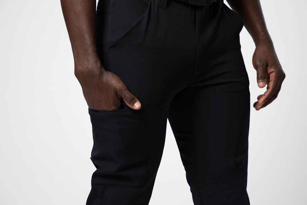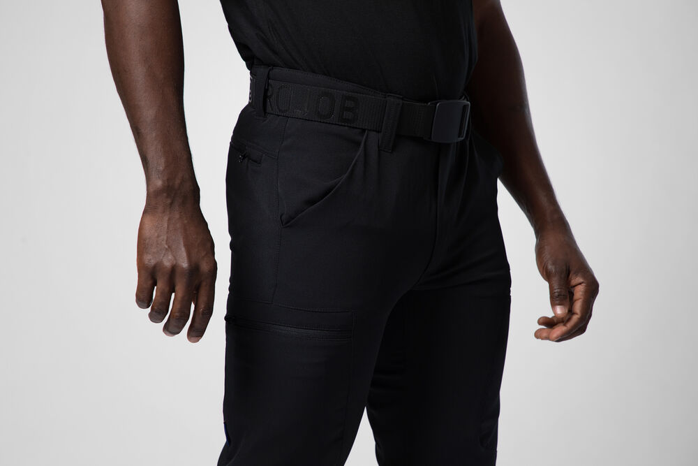 Servicebyxa i full stretch med modern, smal passform. Byxan har ett insytt, justerbart, stretchband i midjan för komfort, även gummerad kant för att hålla byxan på plats. Öppna sidfickor på båda sidor. Benfickor på båda sidor som försluts med dragkedja, även bakfickor med dragkedja. Bredare bälteshälla baktill för att undvika tryck från bälte vid ryggslutet. Dold midjeknapp. Byxan kan förlängas 5 cm genom ett utvik i benslutet.