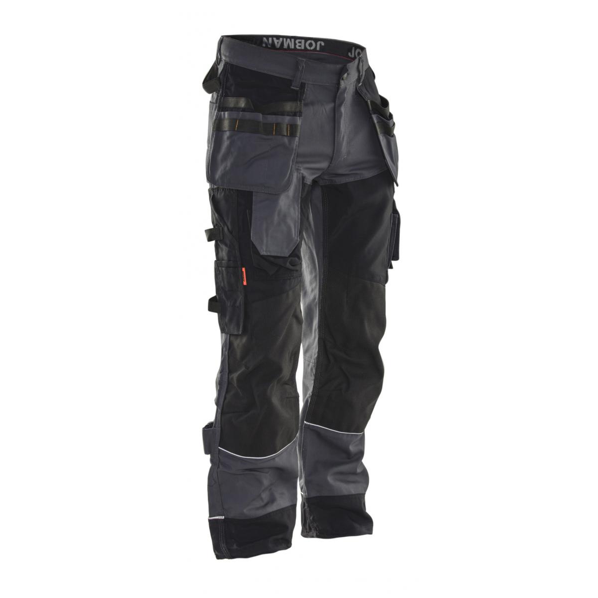 Rymliga hölsterfickor som kan stoppas ned i framfickorna. Bakfickor med förstärkt insida. Hammarhank. Tumstocksficka med knivhållare. Benficka med blixtlås, telefonfack och ID-kortshållare. Ficka för mattläggarknivar på låret. Extra förstärkning på låren i FA™-material. Förböjda knän för optimal passform. Knäskyddsfickor i slitstark DuPont™Kevlar® med två höjdnivåer för knäskydden och reflexpasspoal. Mesh i knävecken för ventilation. Reglerbart kardborreband justerar benvidden runt vaden. Förstärkt benslut i polyamid som inte absorberar fukt. Reflexpasspoal och dragsko i benslutet.