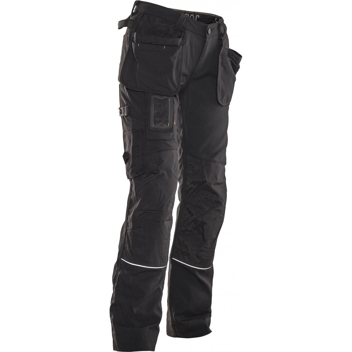 Fast Dry polyamid, mjukt, skönt, lätt och snabbtorkande material med hög slitstyrka. Rymliga hölsterfickor som kan stoppas ned i framfickorna. Gummiknapp som inte repar. Bakfickor med förstärkt insida. Hammarhank. Extra hällor för bältet på de största storlekarna. Tumstocksficka med knivhållare, ID-kortsfack och extrafack. Förböjda knän för optimal passform. Knäskyddsfickor i slitstark polyamid med reflexpasspoaler och två höjdnivåer för knäskydden.
