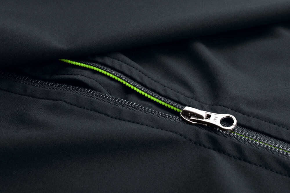 Vindtät och vattenavvisande jacka i ett lätt stretchigt material. Tvåvägsdragkedja framtill med hakskydd för att förhindra skav på hakan. Sidfickor med dragkedja. Samtliga dragkedjor har tänder i kontrastfärg. Innerfickor, den ena med hål för handsfree. Tumgrepp. Reglerbar midja med snodd.