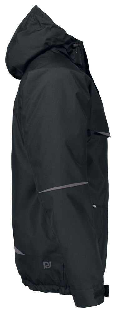 Vind- och vattentät jacka med tejpade sömmar. Quiltat innerfoder. Tvåvägsdragkedja framtill med utvändig vindslå för att förhindra vinddrag samt att vatten tränger in, försluts med tryckknappar, även hakskydd för att förhindra skav. Fleecefoder i kragen för ökad komfort. Bröstfickor på båda sidor som försluts med dragkedja, fodrade invändigt med fleece, den vänstra med invändigt fäste för ID-kort. Sidfickor på båda sidor som försluts med dragkedja, fodrade invändigt med fleece. Rymliga innerfickor med dragkedja, den vänstra med telefonficka. Reglerbar huva i två lägen, huvan är även avtagbar. Reflexdetalj i nederkant baktill, på bröstfickorna samt på ärmarna. Förlängd i rygg. Reglerbar i midja samt jackslut med snodd, reglerbara ärmslut med kardborre. Fodret är öppningsbart för att underlätta förädling.