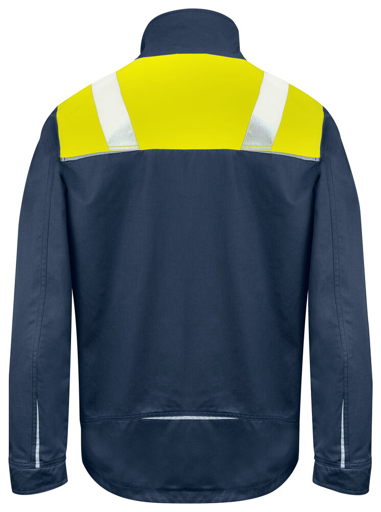 Servicejacka med dragkedja upp i kragen framtill, med invändig vindslå för att förhindra vinddrag samt hakskydd för att förhindra skav. Fleecefoder i kragen för ökad komfort. Bröstfickor, i den vänstra invändigt fäste för ID-kort. Sidfickor med dragkedja. Rymliga innerfickor, även en invändig telefonficka som försluts med kardborre. Förlängd i rygg. Reglerbara ärmslut med kardborre. Fluorescerande tyg samt reflex över axlarna, även reflexpipings i nederkant baktill samt på fickorna framtill.