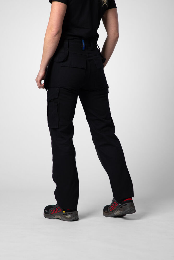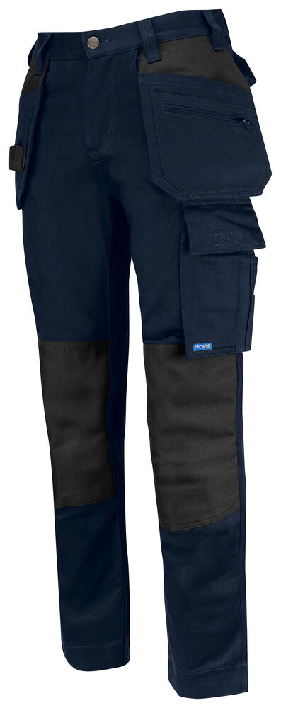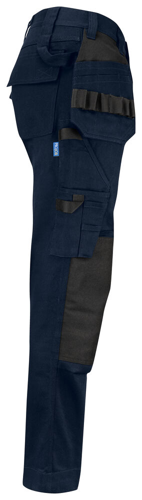 En lättare hantverksbyxa i bomull med undanstoppningsbara hängfickor, den ena med dragkedja. Bakfickor med lock och kardborrestängning. Benficka med extra fack och lock med kardborrestängning. Tumstocksficka med knivhållare. Förstärkning i hängfickor, tumstocksfickan och på knäskyddsfickor. Förböjda knän med knäskyddsfickor som går att reglera i två höjder, öppning inifrån. Kan förlängas med 5 cm genom ett utvik i benslutet. Reflexdetalj/piping bak på vaden.
