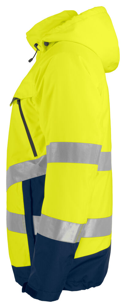Fodrad vind- och vattentät skaljacka med tejpade sömmar. Tvåvägsdragkedja framtill med slag på yttersidan för att förhindra vinddrag samt genomträngning av väta, försluts med tryckknappar. Dubbla bröstfickor på båda sidor, två med lock och kardborreförslutning samt två med vattentäta dragkedjor. Sidfickor på båda sidor som försluts med dragkedja, fodrade invändigt med fleece. En D-ring på vänster bröst för id-kort. Tre rymliga innerfickor, varav två med dragkedja. Avtagbar, reglerbar huva. Förlängd i rygg. Reglerbar i midja och ärmslut. Innertyget i mesh är öppningsbart för att underlätta förädling.
