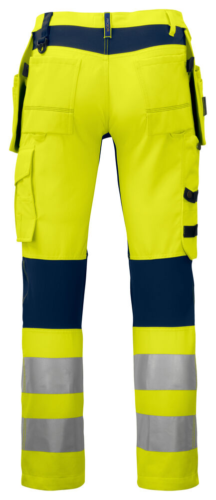 Hantverksbyxa med Cordura®stretch i grenen, baksida knä och under linningen bak för ökad slitstyrka och optimal rörelseförmåga. Avtagbara hängfickor förstärkta i Cordura®, den vänstra med extra fickor och den högra med hållare för verktyg. Dubbla tyg över låren för ökad slitstyrka. Benfickor, på vänster sida ficka med lock som försluts med kardborre, invändig telefonficka samt fäste för ID-kort. På höger sida ficka för tumstock samt verktygsficka med knivknapp. Två reglerbara hammarhankar, en på vardera sida. Två D-ringar, fästa i linningen. Bakfickor med övervidd. Förböjda knän för ökad komfort. Knäskyddsfickor som går att reglera i två höjder, öppning inifrån. Fickor, på baksida ben samt knäna är förstärkta med Cordura® för ökad slitstyrka.