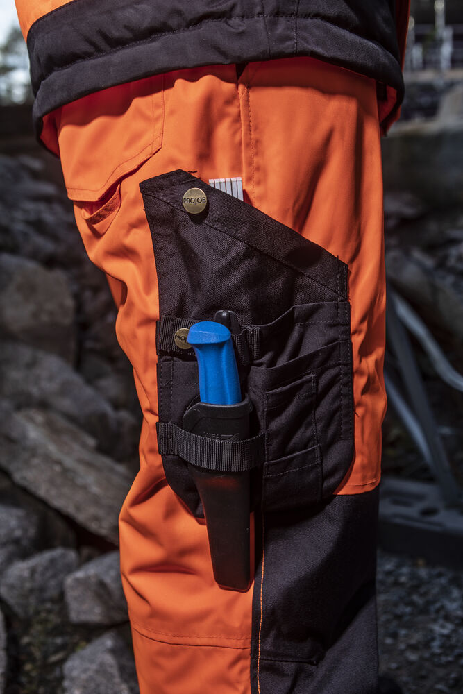 Fodrad midjebyxa i vind- och vattentätt material. Tejpade sömmar. Funktionsmaterialet leder ut överflödig värme från kroppen utan att släppa in vare sig vatten eller vind. Byxan är förhöjd i midjan baktill för att undvika glipor, med invändigt foder i fleece för ökad värme och komfort. Reglerbar i midjan med kardborre. Bredare bälteshälla baktill för att undvika tryck från bälte vid ryggslut. Rymliga sidfickor. Benfickor, på vänster sida ficka med lock som försluts med tryckknapp, invändig telefonficka samt fäste för ID-kort. På höger sida ficka för tumstock samt verktygsficka med knivknapp. Bakfickor med extra vidd, ficklock som försluts med kardborre. Midjebyxan har dragkedjor på utsidan av benen för att underlätta av- och påtagning, bensluten är även reglerbara med tryckknappar. Förböjda knän för ökad komfort. Knäskyddsfickor som går att reglera i två höjder, öppning inifrån. Fickor, benslut samt knäna är förstärkta med Cordura® för ökad slitstyrka.