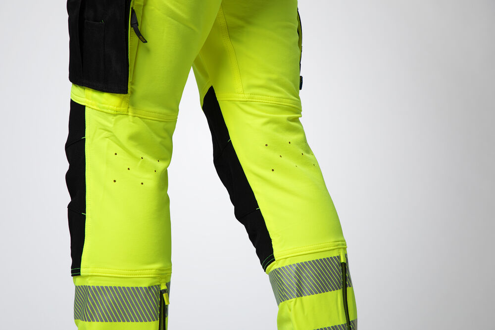 Hantverksbyxa i stretch för maximal rörelsefrihet. Modern passform. Fyrvägsstretch över lår och bak. Sidorna upptill är inte i stretch för att ge bättre stadga åt byxan. Ventilationskanaler med dragkedja längs båda benen, även ventilation i midja. Benfickor, på vänster sida med plats för verktyg och penna, även en mobilficka med magnetlås och fäste för ID-kortshållare. På höger sida tumstocks- och verktygsficka med knivknapp. Sidfickorna är förstärkta upptill med Cordura® för att kunna fästa mätband. Fästen för verktygshållare. Möjlighet att fästa MOLLE-system på båda sidor. Justerbara benslut med snodd. Förböjda knän med knäskyddsfickor som går att reglera i två höjder, öppning inifrån. Knäna är förstärkta med Kevlar för maximal slitstyrka. Segmenterade reflexer från 3M.