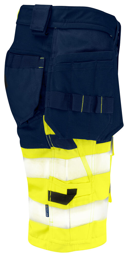 Shorts i stretch för maximal rörelsefrihet. Modern passform. Fyrvägsstretch över lår och bak. Sidorna upptill är inte i stretch för att ge bättre stadga åt shortsen. Hängfickor med Cordura®förstärkt insida, varav den ena med dragkedja. Hängfickorna går att ta av genom att sprätta en kontrastfärgad, dold tråd. Benfickor, på vänster sida med plats för verktyg och penna, även en mobilficka med magnetlås och fäste för ID-kortshållare. På höger sida tumstocks- och verktygsficka med knivknapp. Fästen för verktygshållare. Cordura®förstärkning i bakfickorna samt i hängfickorna. Reflexer från 3M.