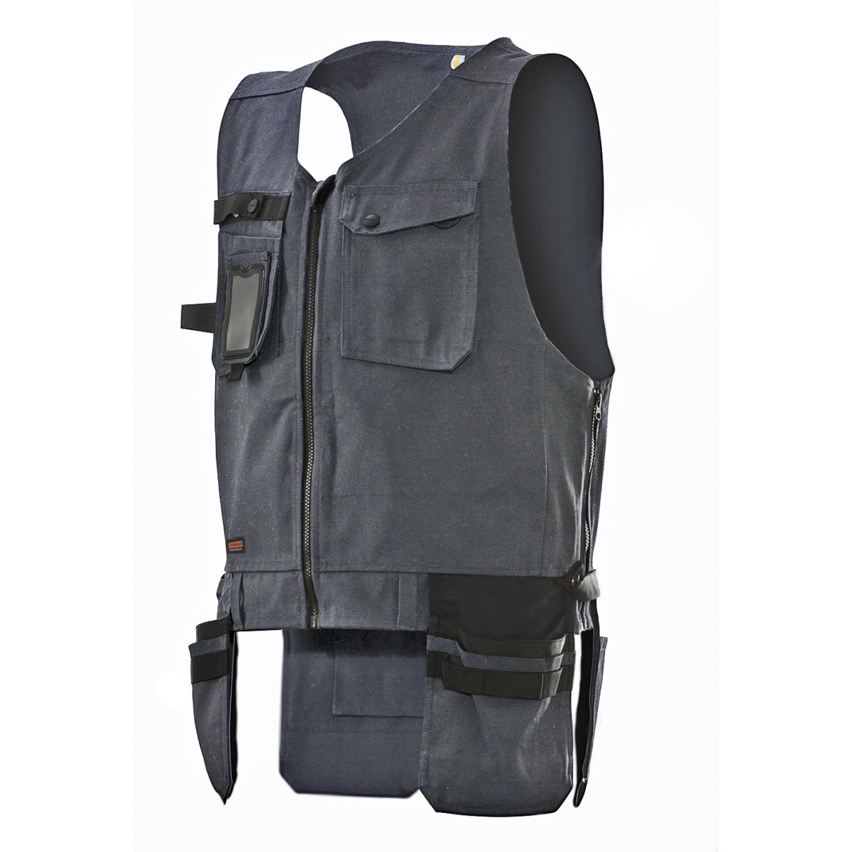 Ringspunnen bomull/polyester är en kvalitet med styrka från polyester och komfort från bomull, vilket ger hög slitstyrka och hög komfort. Bröstfickor med ID-kortsficka, knivknapp och handskfack. Expanderbara sidor för att kunna justera bredden. Förstärkta hölsterfickor. Rymliga framfickor. Hammarhank på båda sidor. Förstärkta bakfickor.