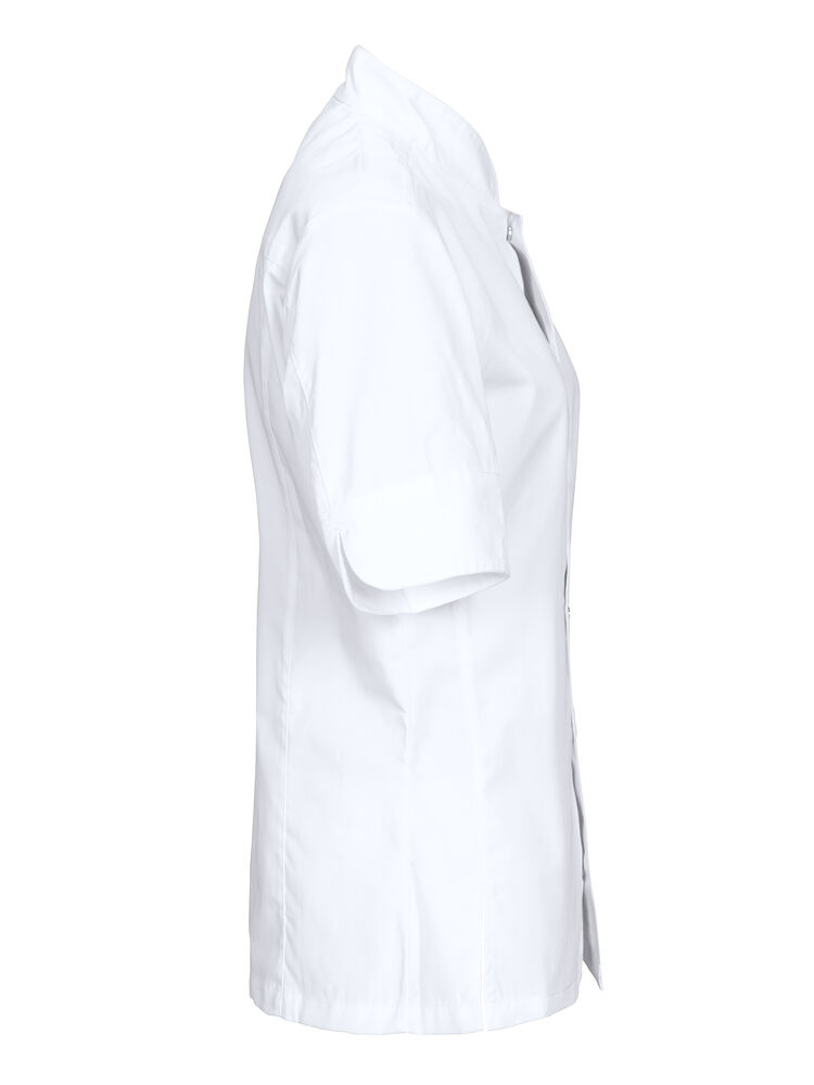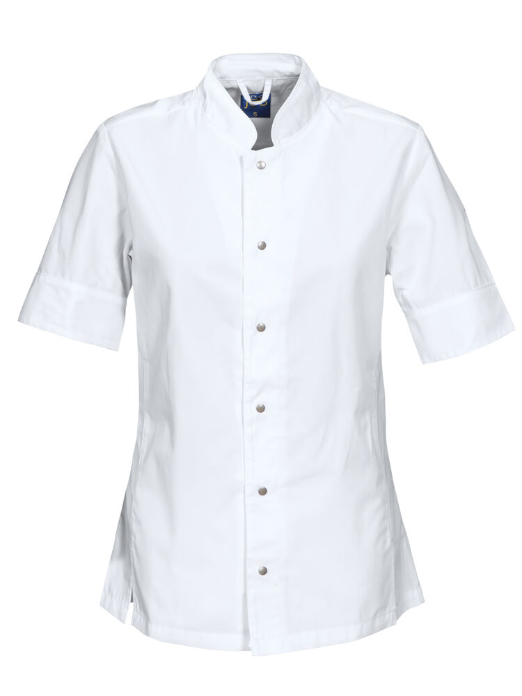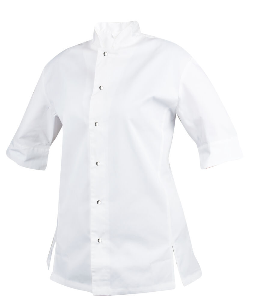 En lättare figursydd kockrock. Passpoal runt kragen. Sprund på vardera sidan framtill, även på ärmarna. Tryckknappar framtill. XX