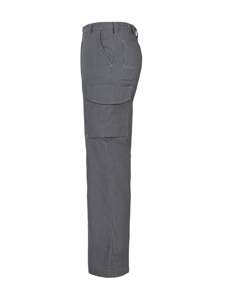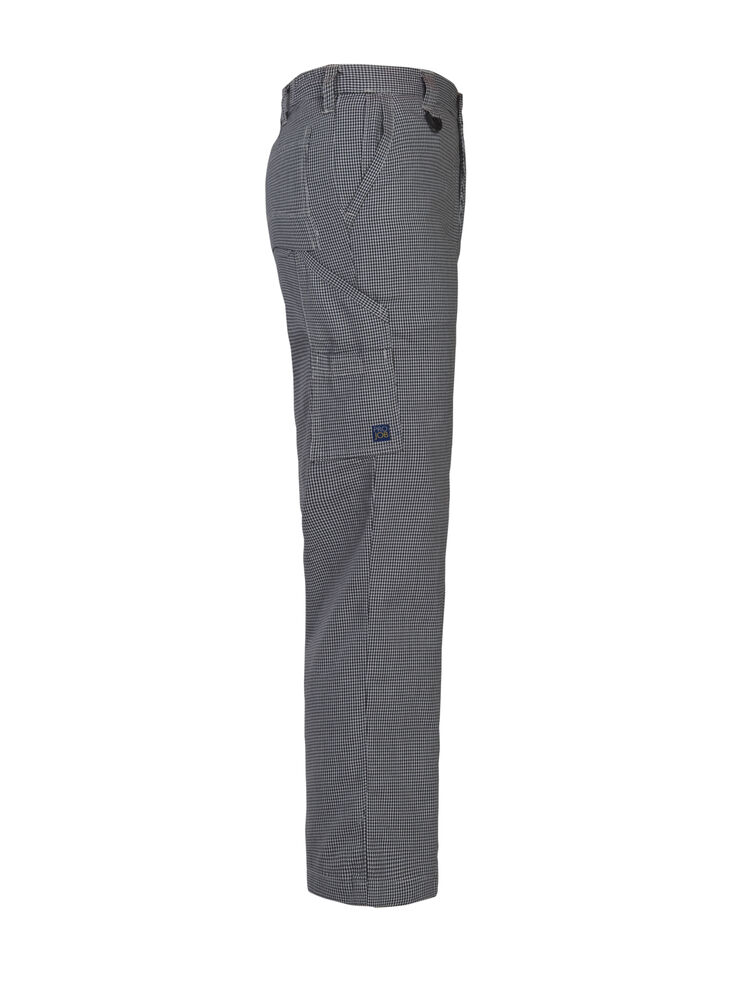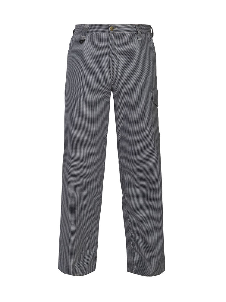 Kockbyxa med många funktionella fickor anpassade för köksredskap. Säkerhetsficka med dragkedja på höger sida. Två benfickor, den högra för palett och pincett och den vänstra med lock och invändig telefonficka. Fäste för ID-kort. Resår i midja. XX