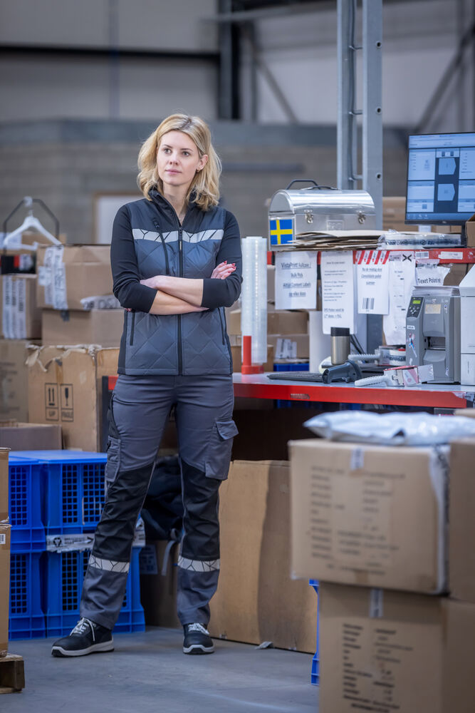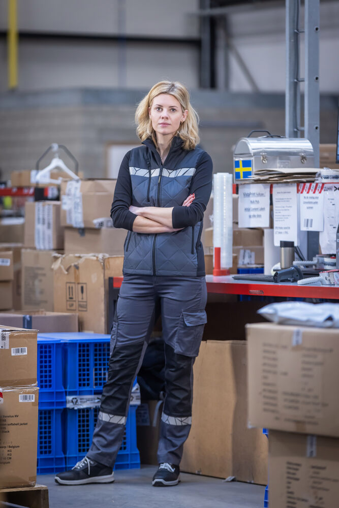 Servicebyxa med öppna sid- och bakfickor. Benfickor, på vänster sida en rymlig ficka med lock och magnetstängning, en invändig mobilficka och ett fäste för ID-kort. På höger sida ficka för tumstock och ficka för verktyg med knivfäste. Förböjda knän, stretchtyg i grenen och insydd stretchpanel i midjan för ökad komfort. Bredare bälteshälla baktill för att förhindra tryck från bälte. Dold midjeknapp. I den inre vänstra sidosömmen finns en tvättchippsficka.