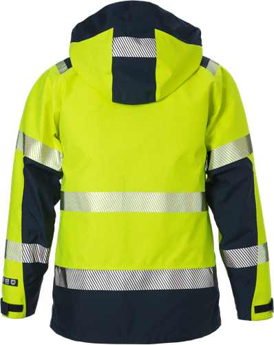 GORE-TEX PYRAD®-material, vatten- och vindtät med andasfunktion / Multinorm / Inherent flamskydd / Smuts- och oljeavvisande / Metallfri / Avtagbar, reglerbar huva / Dragkedja upp i kragen, helt dold under dubbel frontslå / 2 bröstfickor med dragkedja och lock med kardborrelås, den ena med D-ring / 2 framfickor med dragkedja och lock med kardborrelås / 2 innerfickor, varav en med tryckknapp och en med dragkedja / Reglerbart ärmslut / Invändig elastisk mudd / Dragsko i nederkant / Dragkedja i foder för dekal / Vattenpelare > 10.000 mm / ePTFE membran / Andasfunktion RET 8,33 / Godkänd enligt EN 61482-1-2 APC 2, EN 61482-1-1 ELIM: 40 cal/cm² (se ljusbågetabell för certifierade plaggkombinationer enligt EN 61482-1-2 klass 2 och EN 61482-1-1), EN ISO 11612 A1 A2 B2 C1 D3 E3 F1, EN ISO 11611 A1 A2 klass 2, EN 1149-5, EN 13034 typ PB [6], EN ISO 20471 klass 2 för XS-S och klass 3 för M-3XL samt EN 343 klass 4/4 / Certifierad efter 30 tvättar / OEKO-TEX®-certifierad.
