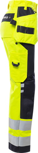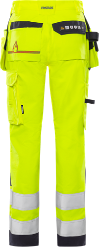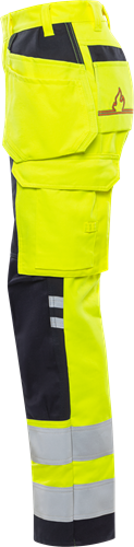 Multinorm / Inherent flamskydd / Smuts-, olje- och vattenavvisande / Dold knapp fram / 2 löst hängande CORDURA®-förstärkta spikfickor – den ena med 3 fickor och verktygshällor, den andra med extra ficka / 2 framfickor / 2 CORDURA®-förstärkta bakfickor, varav en med lock / D-ring vid linningen / Hammarhank / Dubbel förstärkt grensöm / CORDURA®-förstärkt tumstocksficka med verktygsficka, pennficka samt knapp och hälla för kniv / Benficka med lock och dolda tryckknappar, telefonficka och hälla för id-kortshållare / Förstärkning i kontrastfärg på lår / Förböjda ben / CORDURA®-förstärkta knäfickor med öppning inifrån / Knäskydden i knäfickorna kan höjdjusteras / CORDURA®-förstärkta benslut / Reflexerna är påsydda med 2-nålssöm / Godkänd enligt EN 61482-1-2 APC 1, EN 61482-1-1 ELIM: 9 cal/cm² (se ljusbågetabell för certifierade plaggkombinationer av EN 61482-1-2 klass 2 och EN 61482-1-1), EN ISO 11612 A1 A2 B1 C1 F1, EN 1149-5, EN ISO 20471 klass 2, EN 14404 tillsammans med knäskydden 124292 och tyget är godkänt enligt EN 13034 / Certifierad efter 50 tvättar / Testad för industritvätt enligt ISO 15797 / OEKO-TEX®-certifierad.