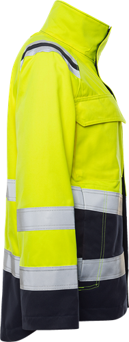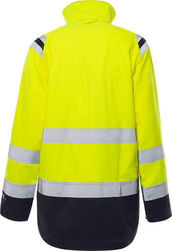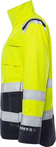 Multinorm / Inherent flamskydd / Smuts-, olje- och vattenavvisande / Dragkedja upp i kragen, under frontslå med dolda tryckknappar / Rymlig bröstficka med invändig D-ring, pennhälla och dolda tryckknappar / Bröstficka med vertikal dragkedja / Dolda knappar och hällor för kniv / Mikrofonhållare / Innerficka med knapp / Invändig telefonficka med kardborrelås och hälla för hörsnäcka / 2 framfickor med dragkedja / Reglerbart ärmslut med tryckknapp / Dragsko i nederkant / Förlängd rygg / Reflexerna är påsydda med 2-nålssöm / Godkänd enligt EN 61482-1-2 APC 1, EN 61482-1-1 ELIM: 9 cal/cm² (se ljusbågetabell för certifierade plaggkombinationer av EN 61482-1-2 klass 2 och EN 61482-1-1), EN ISO 11612 A1 A2 B1 C1 E2 F1, EN ISO 11611 A1 A2 klass 1 (se flam- och svetstabell för certifierade plaggkombinationer), EN 1149-5, EN 13034 Typ PB [6] och EN ISO 20471 klass 2 för XS-M och klass 3 för L-3XL / Certifierad efter 50 tvättar / Testad för industritvätt enligt ISO 15797 / OEKO-TEX®-certifierad.