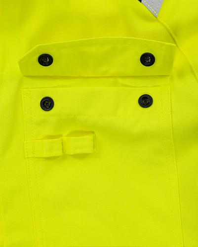 Multinorm / Inherent flamskydd / Metallfri / Frontslå med dolda tryckknappar / 2 bröstfickor med lock och dolda tryckknappar, en med pennhållare / Ärmslut med dolda tryckknappar / Förländ rygg / Reflexer påsydda med 2-nålssöm / Sidsprund / Godkänd enligt EN 61482-1-2 APC 1, EN 61482-1-1 ELIM: 8,2 cal/cm² EBT: 9,1 cal/cm² (se ljusbågetabell för certifierade plaggkombinationer av EN 61482-1-2 klass 2 och EN 61482-1-1), EN ISO 11612 A1 A2 B1 C1 F1, EN 1149-5, EN 13034 typ PB [6] och EN ISO 20471 klass 3 / Testad för industritvätt enligt ISO 15797 / OEKO-TEX®-certifierad.
