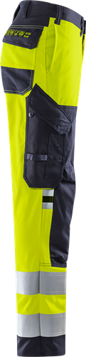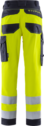 Stretchmaterial / Multinorm / Inherent flamskydd / Smuts-, olje- och vattenavvisande / Metallfri / Dold knapp fram / 2 framfickor / 2 förstärkta bakfickor med lock och dolda tryckknappar / Dubbel förstärkt grensöm / Förstärkt ficka för tumstock och verktyg med lock och dolda tryckknappar, pennhållare samt knapp och hälla för kniv / Benficka med lock och dolda tryckknappar, telefonficka och hälla för id-kortshållare / Förstärkta knäfickor med öppning inifrån / Knäskydden i knäfickorna kan höjdjusteras / Godkänd enligt EN 61482-1-2 APC 1, EN 61482-1-1 ELIM: 8 cal/cm² (ingår i ljusbågecertifierade plaggkombinationer), EN ISO 11612 A1 B1 C1 F1, EN 1149-5, EN ISO 11611 A1 klass 1 (ingår i flam- och svetscertifierade plaggkombinationer), EN 13034 typ PB [6], EN ISO 20471 klass 2 och EN 14404 tillsammans med knäskydd 124292 / Certifierad efter 50 tvättar / Testad för industritvätt enligt ISO 15797 / OEKO-TEX®-certifierad.