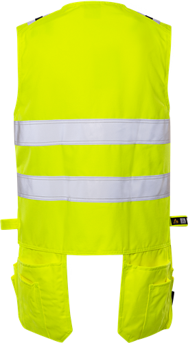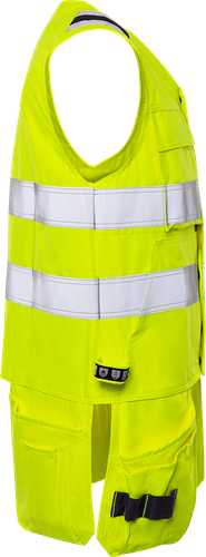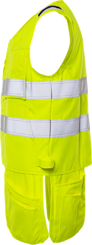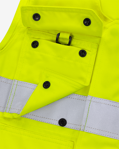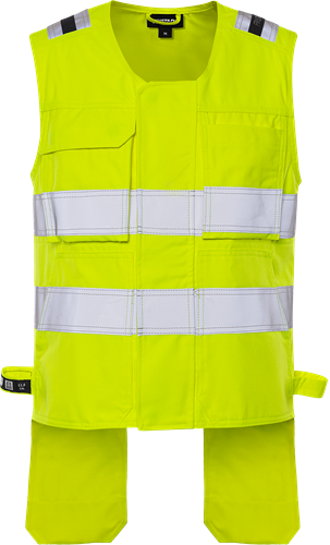 Inherent flamskydd / Smuts-, olje- och vattenavvisande / Dragkedja under frontslå med dolda tryckknappar / 2 löst hängande bröstfickor som kan knäppas fast med tryckknappar – den ena med lock, D-ring och dolda tryckknappar / 2 framfickor / 2 löst hängande invikbara CORDURA®-förstärkta framfickor – den ena med tre fickor och verktygshällor, den andra med extra ficka / 2 löst hängande CORDURA®-förstärkta bakfickor, båda med extra verktygsficka / 2 hammarhankar / Reflexerna är påsydda med 2-nålssöm / Godkänd enligt EN 61482-1-2 APC 1, EN 61482-1-1 ELIM: 9 cal/cm², EN ISO 11612 A1 A2 B1 C1 F1 och EN 1149-5 om den bärs tillsammans med långärmade plagg med minst samma certifieringar, EN ISO 20471 klass 2 och tyget är godkänt enligt EN 13034 / Certifierad efter 50 tvättar / Testad för industritvätt enligt ISO 15797 / OEKO-TEX®-certifierad.