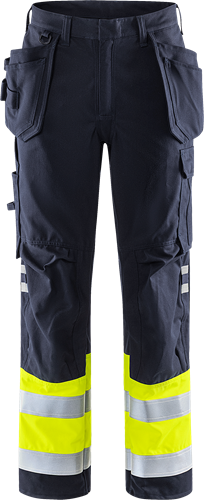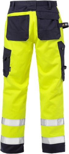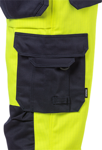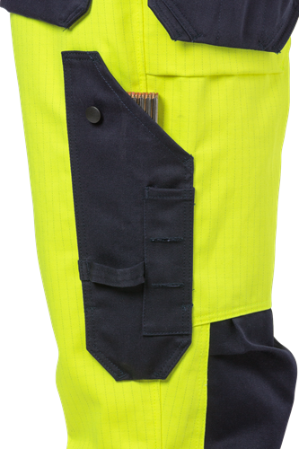 Multinorm / 2 CORDURA®-förstärkta löst hängande spikfickor, den ena med 3 fickor och verktygshällor och den andra med extra ficka / 2 framfickor / 2 CORDURA®-förstärkta bakfickor, varav en med lock och dold tryckknapp / Dubbel förstärkt grensöm / Hammarhank / CORDURA®-förstärkt tumstocksficka med pennficka samt knapp och hälla för kniv / Benficka med lock och dold tryckknapp, telefonficka med lock och D-ring / CORDURA®-förstärkta knäfickor / Knäskydden i knäfickorna kan höjdjusteras / CORDURA®-förstärkning i benslut / Godkänd enligt EN 61482-1-2 APC 1, EN 61482-1-1 ELIM: 8 cal/cm² (se ljusbågetabell för certifierade plaggkombinationer enligt EN 61482-1-2 klass 2 och EN 61482-1-1), EN ISO 11612 A1 B1 C1 F1, EN 1149-5, EN ISO 20471 klass 2 och EN 14404 tillsammans med knäskydden 124292 / Certifierad efter 50 tvättar / Testad för industritvätt enligt ISO 15797 / OEKO-TEX®-certifierad.