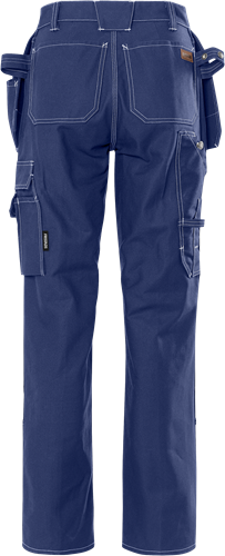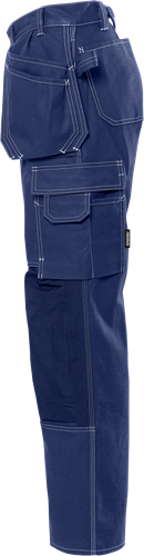 FAS® bomull / 2 löst hängande CORDURA®-förstärkta undanstoppningsbara spikfickor – den ena med extra ficka, den andra med 3 mindre fickor och verktygshällor / 2 rymliga fram- och bakfickor / D-ring / 2 hammarhankar, varav en justerbar / Tumstocksficka av CORDURA® med pennficka samt knapp och hälla för kniv / Benficka med lock, telefonficka och extra ficka med hälla för bifogad id-kortshållare / Knäfickor av CORDURA® med öppning utifrån / Knäskydden i knäfickorna kan höjdregleras / Godkänd enligt EN 14404 tillsammans med knäskydd 124292 / OEKO-TEX® certifierad.