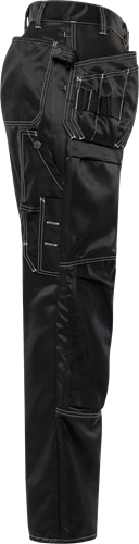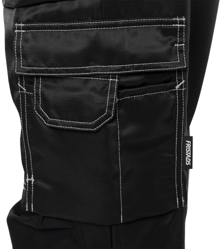 Polydex – vattenavvisande material med borstad insida / 2 löst hängande undanstoppningsbara spikfickor – den ena med extra ficka, den andra med 3 mindre fickor och verktygshällor / 2 rymliga fram- och bakfickor / 2 hammarhankar, varav en justerbar / Tumstocksficka av CORDURA® med pennficka samt knapp och hälla för kniv / Benficka med lock, telefonficka och extra ficka med hälla för bifogad id-kortshållare / Knäfickor av CORDURA® med öppning utifrån / Knäskydden i knäfickorna kan höjdregleras / Godkänd enligt EN 14404 tillsammans med knäskydd 124292 / OEKO-TEX® certifierad.
