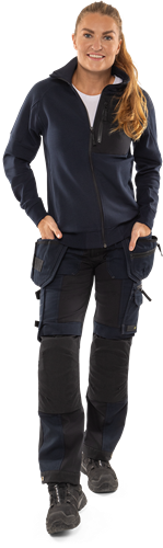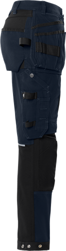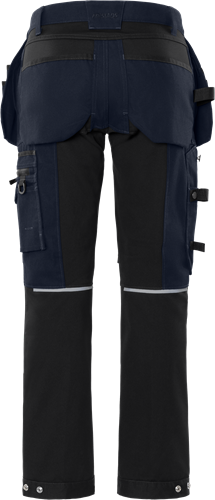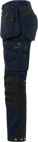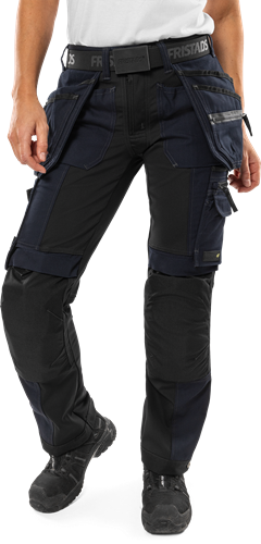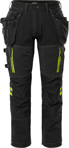 Stora partier med 4-vägsstretch fram, bak och på benen / 2 löst hängande CORDURA®-förstärkta spikfickor, den ena med 3 mindre fickor och verktygshällor, den andra med två fickor varav en med dragkedja / 2 framfickor / 2 sidfickor, den ena med dragkedja / 2 CORDURA®-förstärkta bakfickor med lös botten / D-ring under spikficka / Dubbel förstärkt grensöm / Hammarhank / CORDURA®-förstärkt tumstocksficka med verktygsficka, pennficka samt knapp och hälla för kniv / Rymlig benficka med tryckknapp, vattentät ficka med dragkedja, telefonficka och extra ficka med D-ring för id-kortshållare / Knäfickor i CORDURA® med öppning utifrån, uppifrån / Knäskydden i knäfickorna kan höjdjusteras / CORDURA®-förstärkta benslut, reglerbara med tryckknappar / Reflexdetaljer på bakbenen / Godkänd enligt EN 14404 tillsammans med knäskydd 124292 / OEKO-TEX®-certifierad.