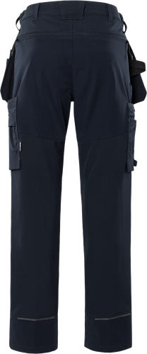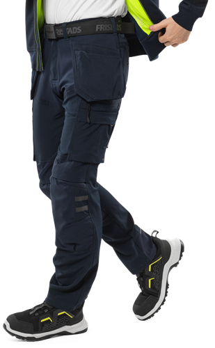 Lättviktsmaterial med 4-vägsstretch / Slitstarkt ripstop-material med 4-vägsstretch fram och bak / Invändig sidoresår i midjan / 2 löst hängande förstärkta spikfickor, den ena med 3 mindre fickor och verktygshällor, den andra med extra ficka / Dold knapp i midjan / 2 framfickor / 2 bakfickor med dragkedja / Dubbel förstärkt grensöm / Hammarhank / Tumstocksficka i ripstop stretch, benficka med tryckknapp, ficka med dragkedja, pennficka och 2 verktygsfickor samt knapp och hälla för kniv / Benficka med tryckknapp, ficka med dragkedja samt telefonficka, id-kortsficka och D-ring under lock / Knäfickor i ripstop stretch med öppning utifrån, uppifrån / Knäskydden i knäfickorna kan höjdjusteras / Ripstop-förstärkt benslut / Reflexdetaljer / Godkänd enligt EN 14404 tillsammans med knäskydd 124292 / OEKO-TEX®-certifierad.