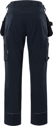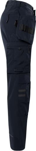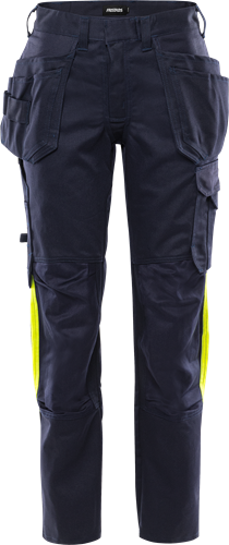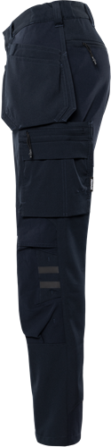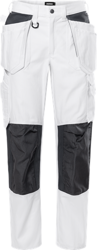 Delvis återvunnet material / Lättvikts 4-vägs stretchmaterial / Slitstarkt ripstop-material med 4-vägs stretch fram och bak / 2 löst hängande förstärkta spikfickor, den ena med 3 mindre fickor och verktygshällor, den andra med extra ficka / Dold knapp i midjan / 2 framfickor / 2 bakfickor med dragkedja / Dubbel förstärkt grensöm / Hammarhank / Tumstocksficka i ripstop stretch, benficka med tryckknapp, ficka med dragkedja, pennficka och 2 verktygsfickor samt knapp och hälla för kniv / Benficka med tryckknapp, ficka med dragkedja samt telefonficka, id-kortsficka och D-ring under lock / Knäfickor i ripstop stretch med öppning utifrån, uppifrån / Knäskydden i knäfickorna kan höjdjusteras / Ripstop-förstärkt benslut / Reflexdetaljer / Godkänd enligt EN 14404 tillsammans med knäskydd 124292 / OEKO-TEX®-certifierad.