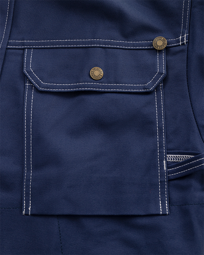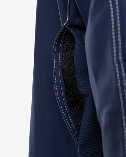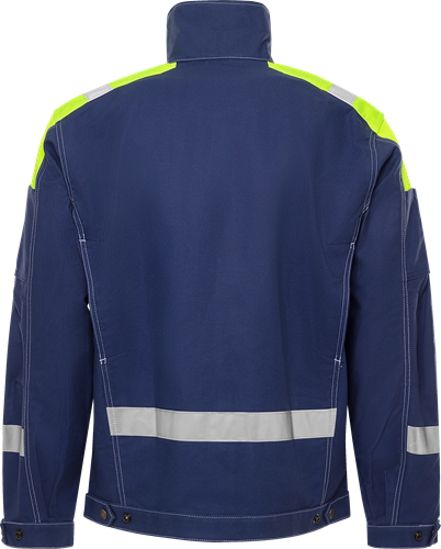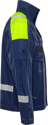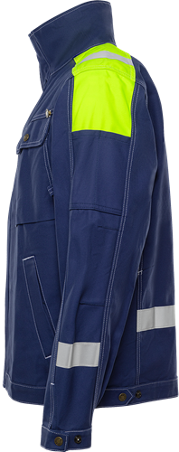 FAS® bomull / Gult axelparti och reflexer på axlar, ärmar och rygg / Dolda ventilerande nät i ryggens sidor / Dragkedja upp i kragen under frontslå med dolda tryckknappar / 2 bröstfickor med lock och knapp, den ena med knapp och hälla för kniv, den andra med verktygshällor / 2 framfickor med dold tryckknapp / Innerficka med kardborrelås / Ärmficka med två fack / Pennficka och id-kortsficka som kan döljas på ärm / Reglerbar i nederkant och ärmslut / OEKO-TEX® certifierad.