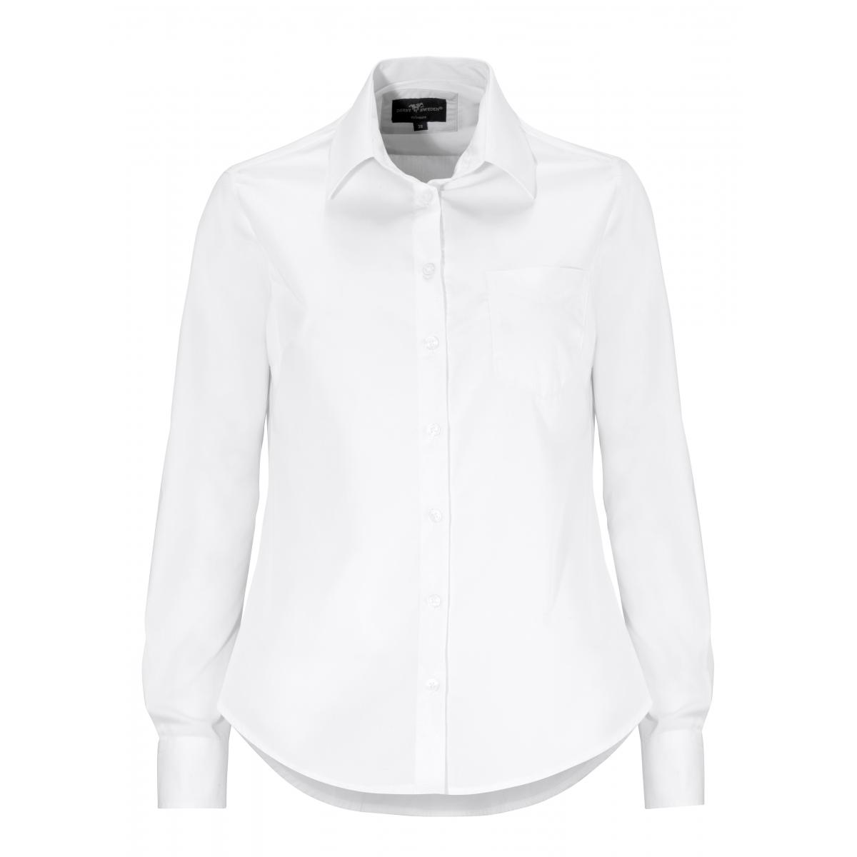 Långärmad poplinskjorta i blandmaterial. Bröstfickor, ton i ton knappar och turn down-krage på alla modeller. Dammodellen är insvängd för bättre passform.