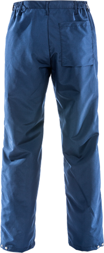 Linning med hällor och resår i sidorna / Dold dragkedja och tryckknappar / 2 sidfickor med lock / Bakficka / Reglerbart benslut med tryckknappar / Bound seam / Autoklaverbar 121° max 20 min / Materialet godkänt enligt EN 1149-3 / ISO klass 7 / OEKO-TEX®-certifierad.
