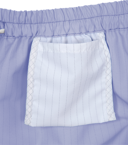 Modell som joggingbyxa / Resår och dragsko i midja / Innerficka för nycklar / Öppna ben / Bound seam / Autoklaverbar 121° max 20 min / Materialet godkänt enligt EN 1149-3 / ISO klass 7 / OEKO-TEX®-certifierad.