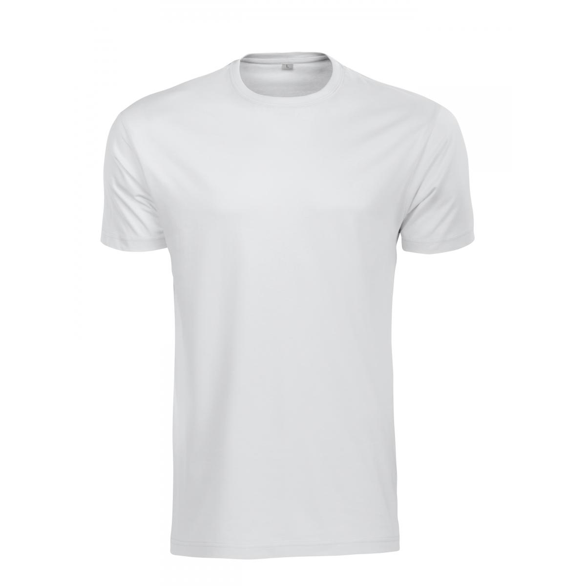 T-shirt i skön singeljersey. Smal halsribb med elastan och nackband. Herrmodellen är rundstickad i modern passform. Dammodellen har en insvängd passform med sidsöm.