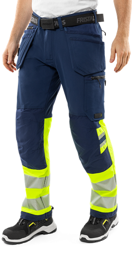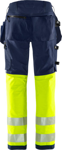 Delvis biobaserat och återvunnet material / Miljödeklarerad (EPD) / 4-vägs stretchmaterial / Ribbstickade stretchpartier i midjan / Slitstarkt ripstop-material med 4-vägsstretch på stuss och baksida lår / Dold knapp fram / 2 löst hängande CORDURA®-förstärkta spikfickor – den ena med ficka med dragkedja, 3 mindre fickor och verktygshällor, den andra med extra ficka / D-ring under spikfickan / 2 framfickor / 2 bakfickor med lös botten, varav en med dragkedja / Dubbel förstärkt grensöm / Hammarhank / CORDURA®-förstärkt tumstocksficka med verktygsficka, pennficka samt knapp och hälla för kniv / Benficka med tryckknapp, ficka med dragkedja och D-ring / Knäfickor i CORDURA® med öppning inifrån / Knäskydden i knäfickorna kan höjdjusteras / CORDURA®-förstärkt benslut / Dold kängkrok / Godkänd enligt EN ISO 20471 klass 1, EN 14404 tillsammans med knäskydd 124292 och EN 13758-2 UPF 40+ UV-skydd / Certifierad efter 50 tvättar / EPD reg.nr 3887 på environdec.com / OEKO-TEX®-certifierad.
