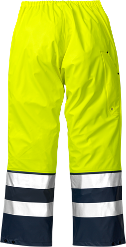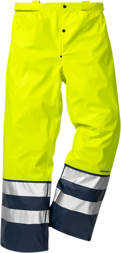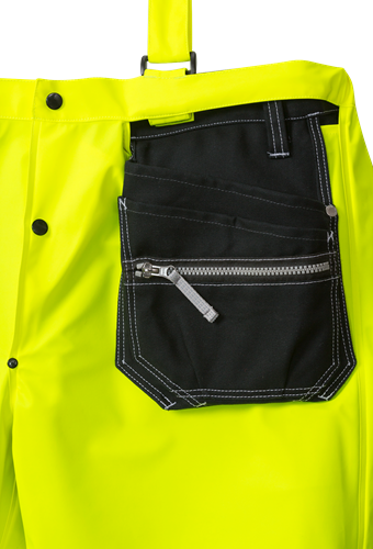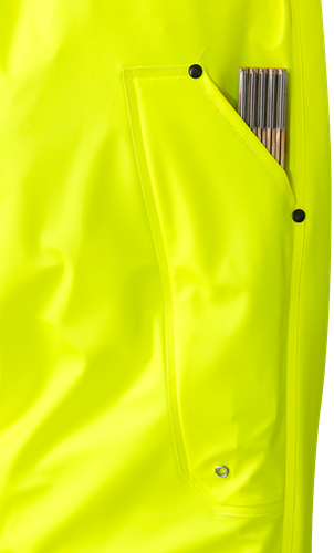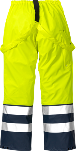 Vattentätt stretchmaterial / Svetsade sömmar / Avtagbara hängslen / Resår i midjan bak / Öppning för löst hängande spikfickor / Knäppning fram för lättare påtagning / Tumstocksficka / Reglerbart benslut / Godkänd enligt EN ISO 20471 klass 2 och EN 343 klass 4/1 / OEKO-TEX®-certifierad.