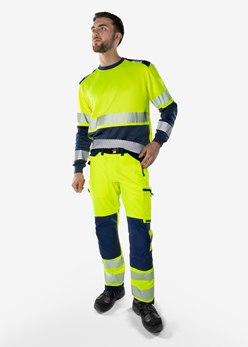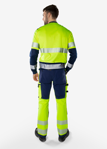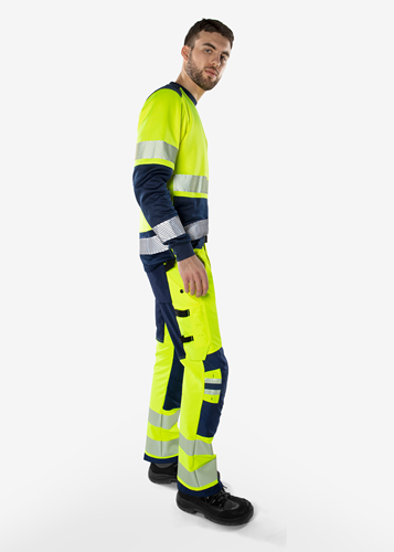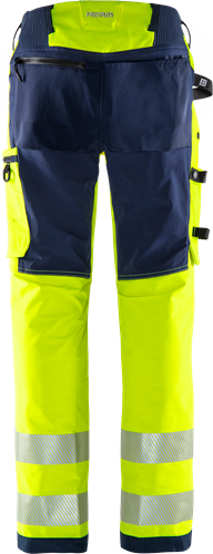 Delvis biobaserat och återvunnet material / Miljödeklarerad (EPD) / 4-vägs stretchmaterial / Ribbstickade stretchpartier i midjan / Slitstarkt ripstop-material med 4-vägsstretch på stuss och baksida lår / Dold knapp fram / D-ring / 2 framfickor / 2 bakfickor med lös botten, varav en med dragkedja / Dubbel förstärkt grensöm / Hammarhank / CORDURA®-förstärkt tumstocksficka med verktygsficka, pennficka samt knapp och hälla för kniv / Benficka med tryckknapp, ficka med dragkedja och D-ring / Knäfickor i CORDURA® med öppning inifrån / Knäskydden i knäfickorna kan höjdjusteras / CORDURA®-förstärkt benslut / Dold kängkrok / Godkänd enligt EN ISO 20471 klass 2, EN 14404 tillsammans med knäskydd 124292 och EN 13758-2 UPF 40+ UV-skydd / Certifierad efter 50 tvättar / EPD reg.nr 3888 på environdec.com / OEKO-TEX®-certifierad.