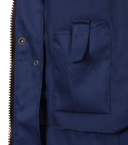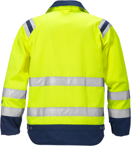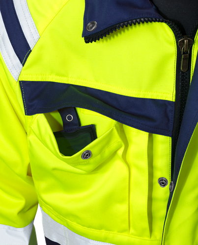 Dragkedja ända upp i kragen under frontslå med tryckknappar / Rymlig bröstficka med lock, D-ring, id-kortshållare och pennhälla / 2 bröstfickor med vertikala dragkedjor / 2 framfickor med dragkedja / Invändig telefonficka / Innerficka / Reglerbar i midja och ärmslut / Förlängt bakstycke / Reflexerna är påsydda med 2-nålssöm / Godkänd enligt EN ISO 20471 klass 2 för XS-S och klass 3 för M-4XL / Certifierad efter 50 tvättar / Testad för industritvätt enligt ISO 15797 / Miljödeklarerad, EPD reg.nr 3878 på environdec.com / OEKO-TEX®-certifierad / Plagget går att förädla med en öppning i ryggen så att säkerhetssele kan användas.